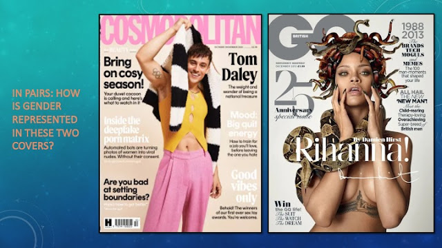 Gender is represented differently in the two magazines. This can be seen as different because on cosmopolitan the star vehicle is male and wearing the colours pink and yellow which goes against stereotypes of males, he is also wearing a top that is shorter and would be classed as "feminine" that shows his stomach. The magazine is aimed at women so by using the opposite gender which is also dressed against stereotypes it goes against gender representation. Whereas in comparison, GQ uses Rihanna as the star vehicle and she is naked with snakes on her. This is sexual objectification of her and the use of snakes making her look like medusa which was a "cursed" woman. This is going towards the stereotypical gender representation because its a male cover and the use of a naked woman in the background would be used to 'appeal to the male gaze'.